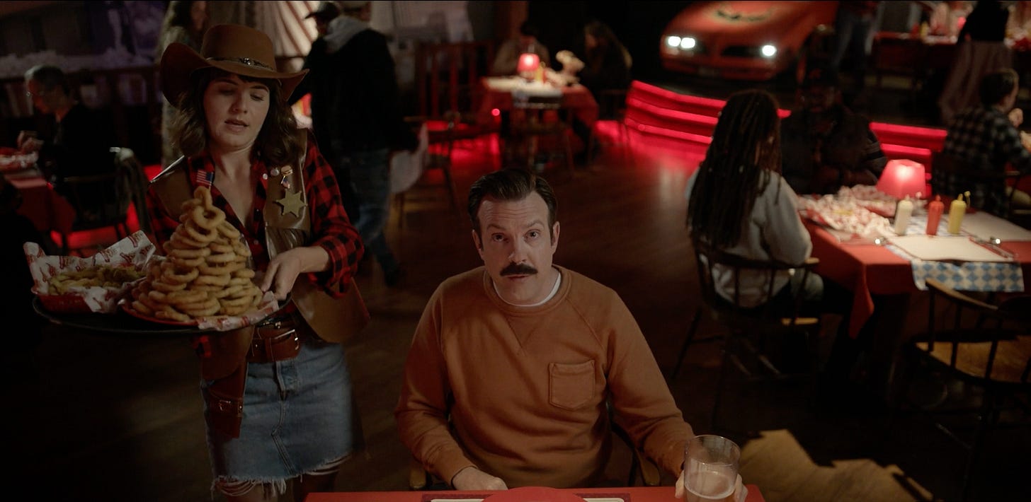 Alone, Ted settles himself for a meal at Yankee Doodle Burger Barn, an American-style restaurant. The establishment has put together a mishmash of U.S. iconography, with cowboy hats and a wall decal of Chance the Rapper, but it’s not exactly authentic. His southern-sounding waiter is actually an Australian who doesn’t know that the “Windy City” is also known as Chicago. Still, the simulation that Ted is thrust within brings back real memories; there’s a dartboard like the one he and his father used, a game playing on the TV that he knows well, and gloriously, Arthur Bryant's Barbeque Sauce. Just one taste transports him into a high that enlightens him on how he can help his team, using basketball strategy direct from the Chicago Bulls.